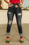 Denim distressed skinny jeans with sequin patches detail. 5 pocket jeans. Comfortable adjustable elastic waistband so there are no gaps in your waistline. Curved back yoke that makes the butt look better. Super soft and stretch fabric for the best comfort.